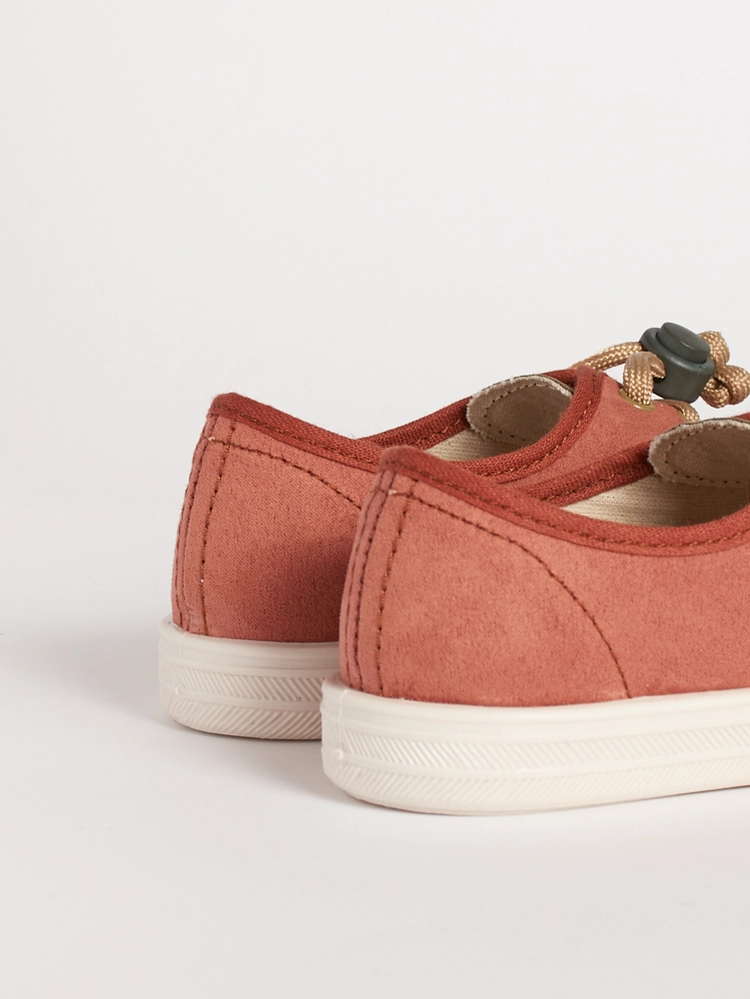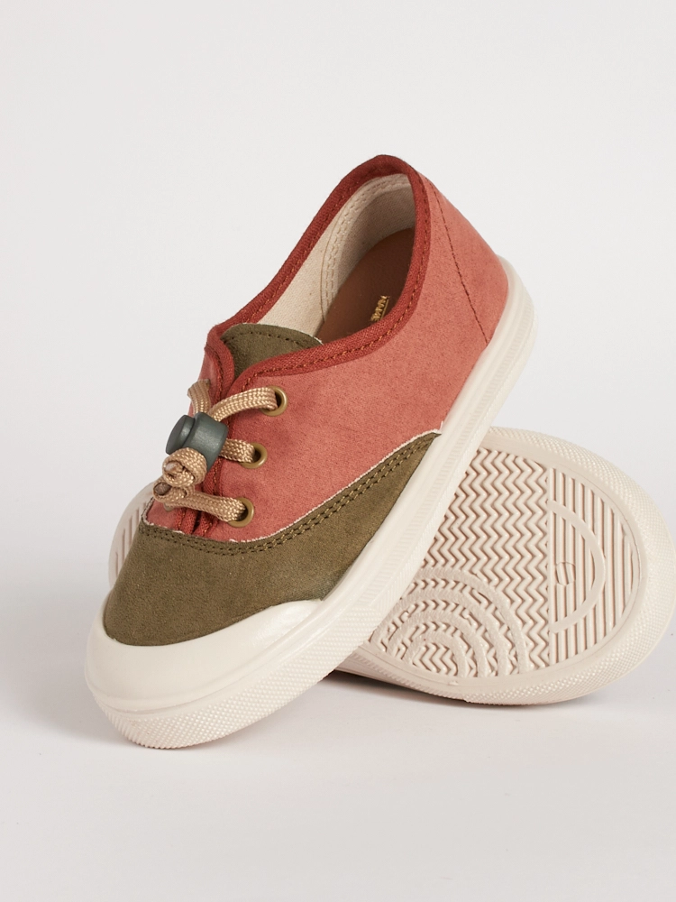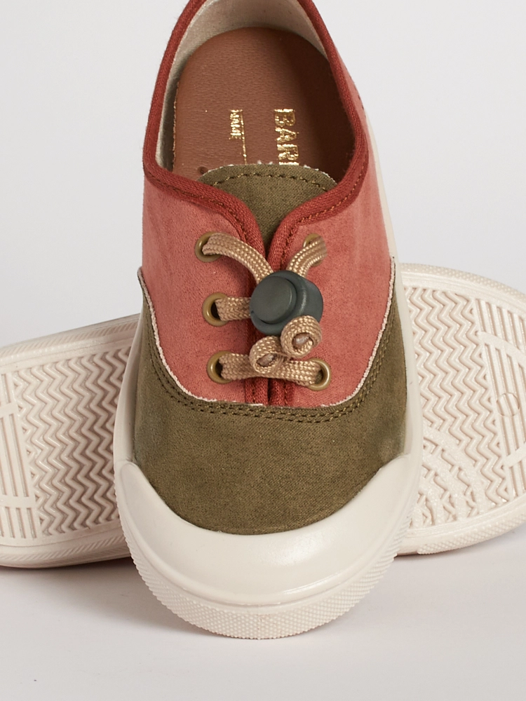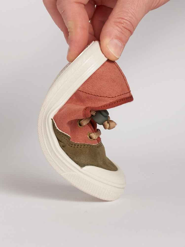 - Tomaia in tessuto BIO bicolore (vinaccia e verde) ad effetto scamosciato;