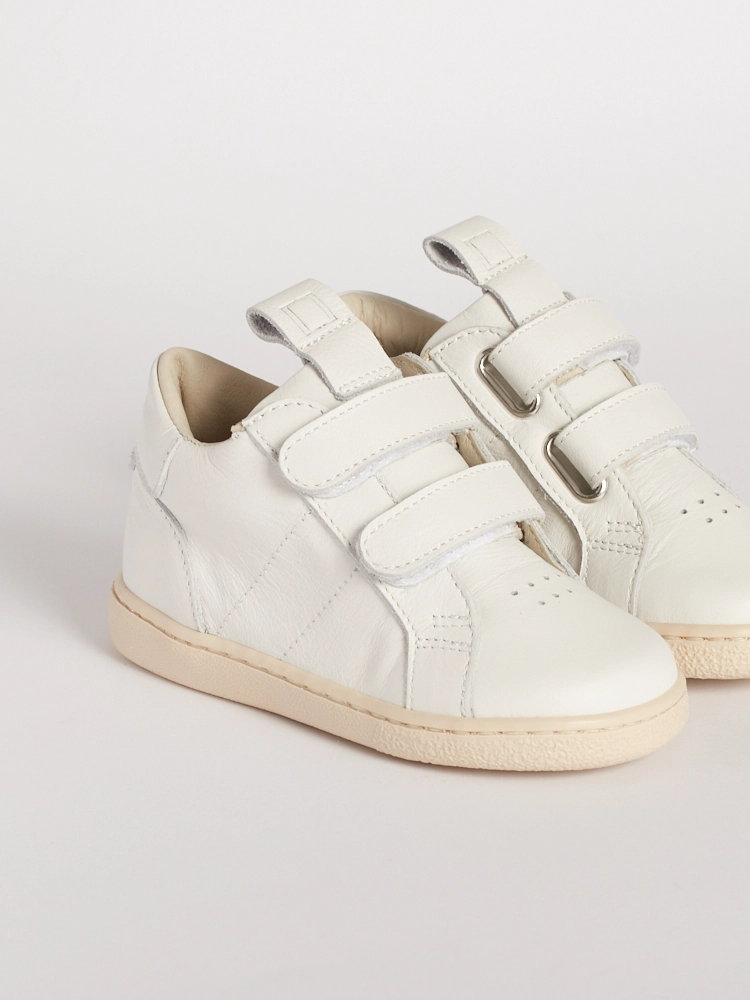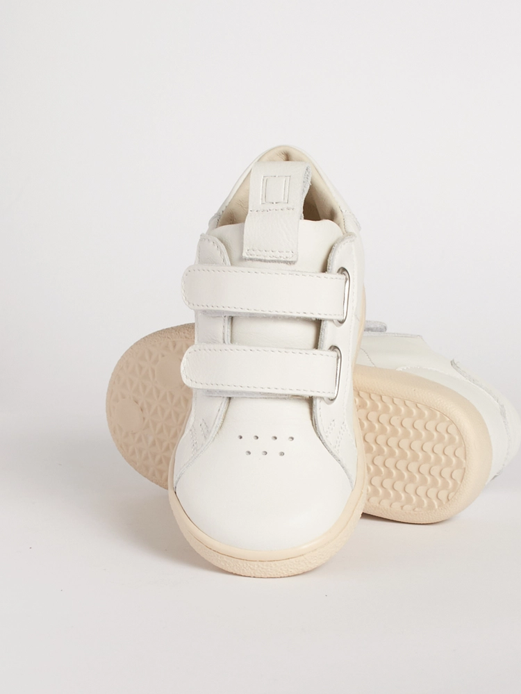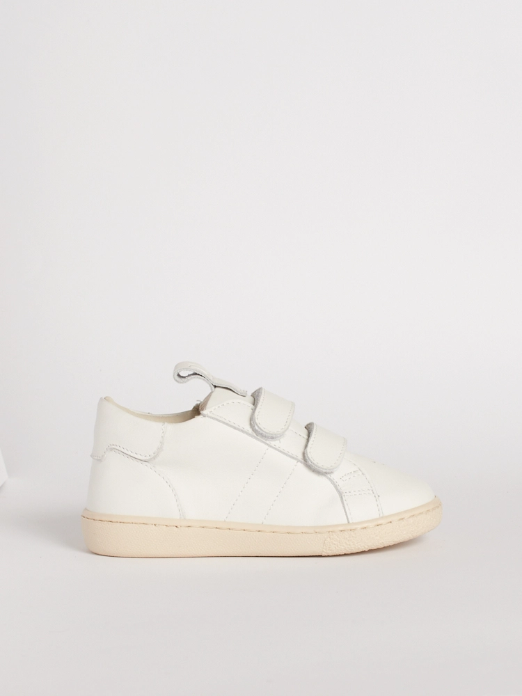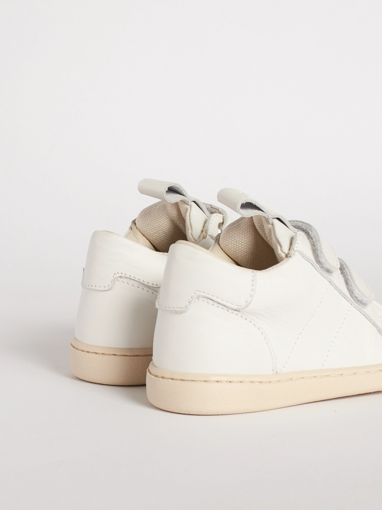 Questa scarpa bambino suola flessibile in pelle bianca si adatta alla crescita, diventando più longilinea dalla taglia 24.