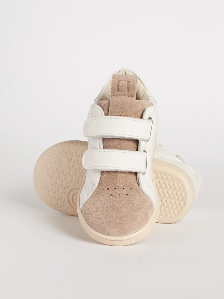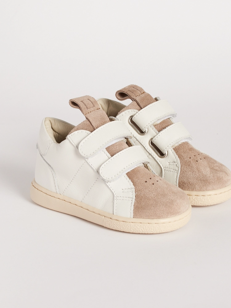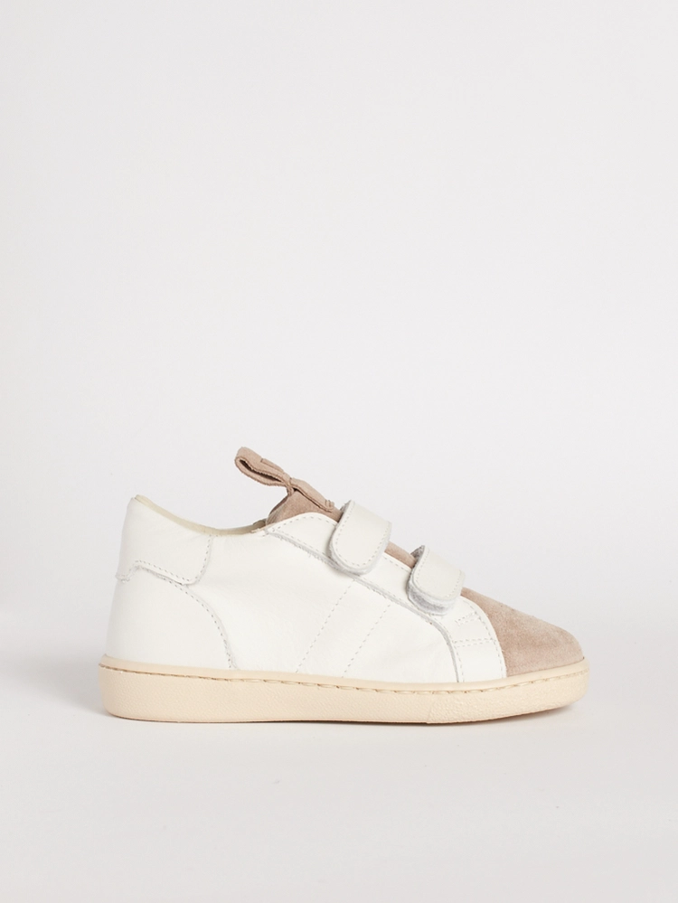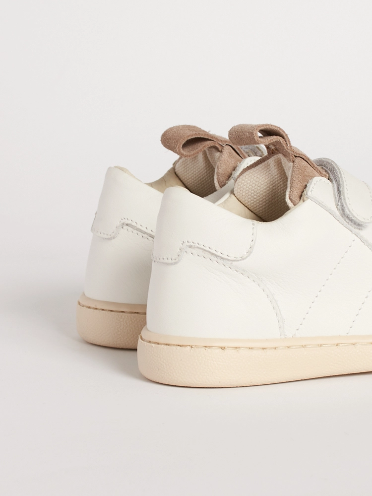 Questa scarpa bambino suola flessibile in pelle bianca si adatta alla crescita, diventando più longilinea dalla taglia 24.