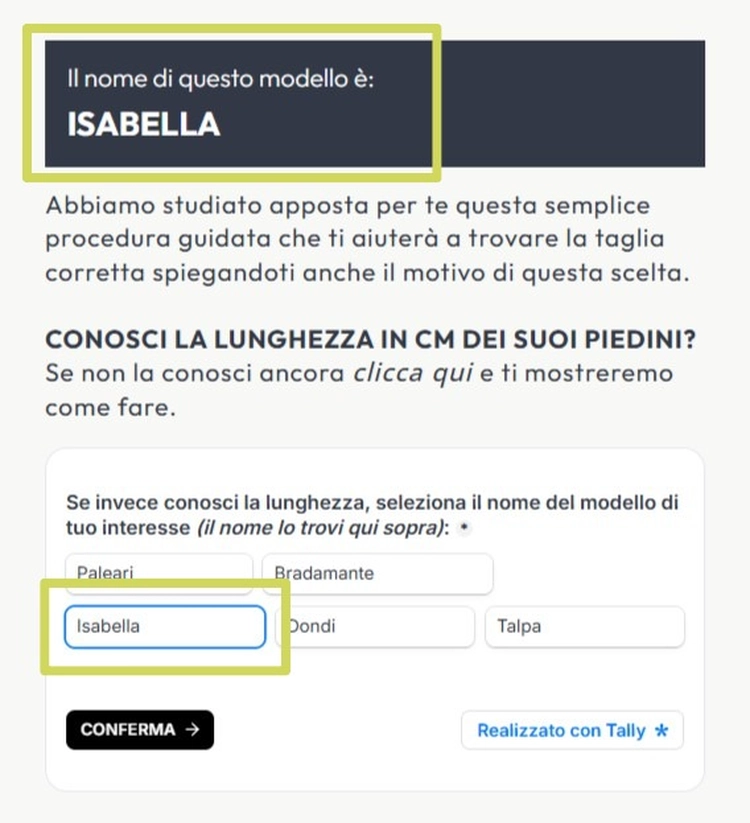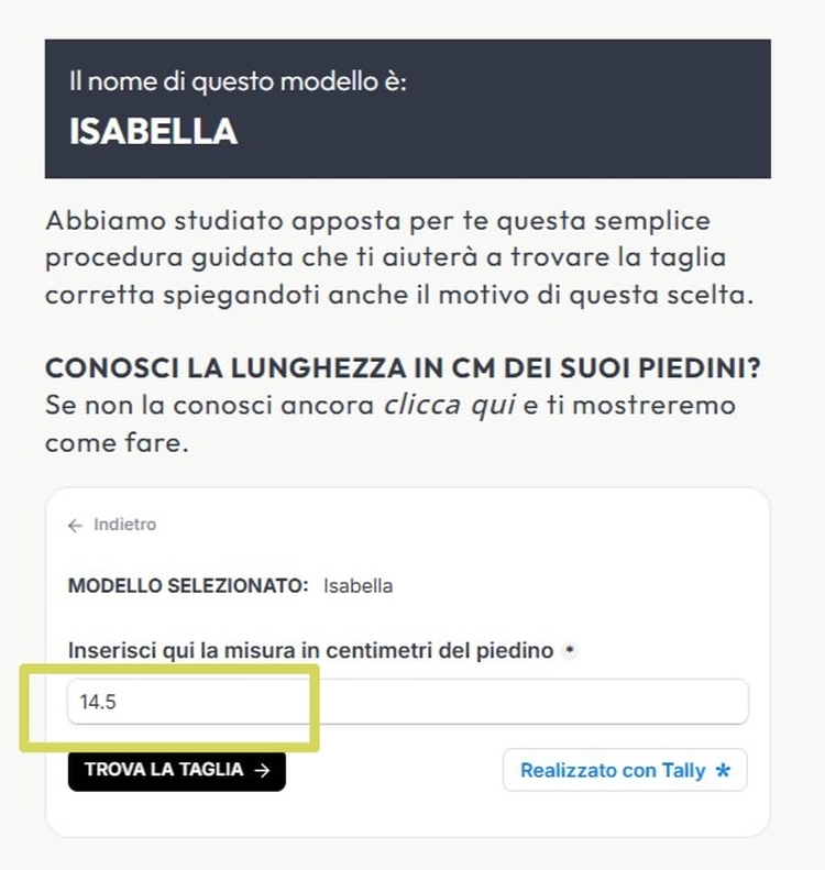 Abbiamo aggiunto da poco, solo per la nuova collezione, un nuovo metodo più semplice e immediato per trovare la taglia da selezionare. Si tratta di una procedura guidata nella quale dovrete inserire 2 dati: il modello e la lunghezza esatta dei suoi piedini. La procedura la troverete cliccando su 'TROVA LA TAGLIA' all'interno della descrizione del modello.