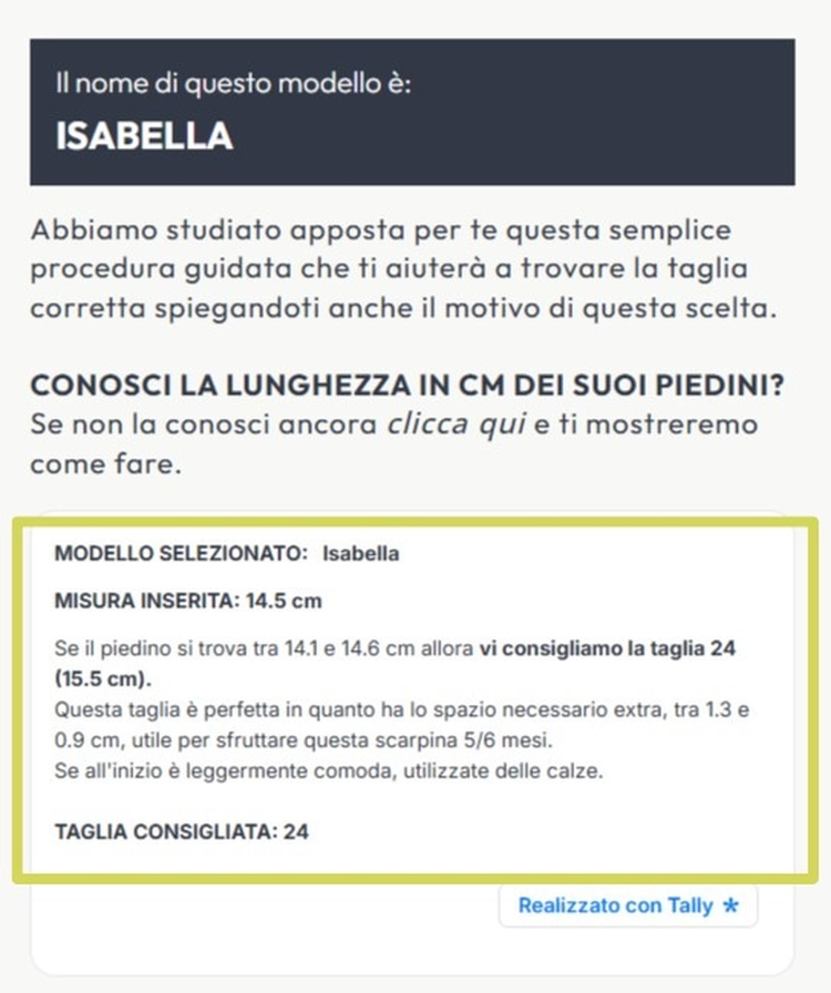 Il risultato sarà la taglia da selezionare e la nostra motivazione,